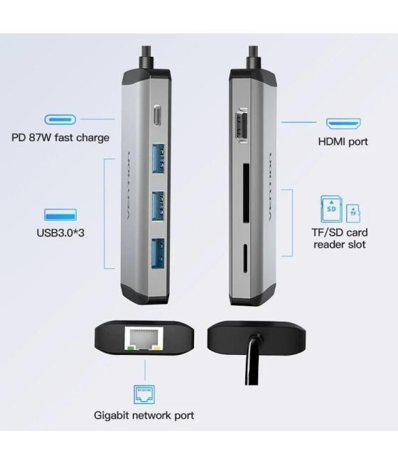 VENTION - Docking usb tipo-c vention tguhb/ rj45/ 2xusb/ 1xusb tipo-c/ 1xhdmi/ 1xusb tipo-c pd/ 1xlector de tarjetas/ gris