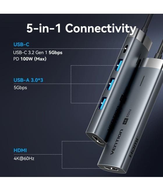 VENTION - Docking usb tipo-c vention tgmhb/ 3xusb/ 1xhdmi 4k/ 1xusb tipo-c pd