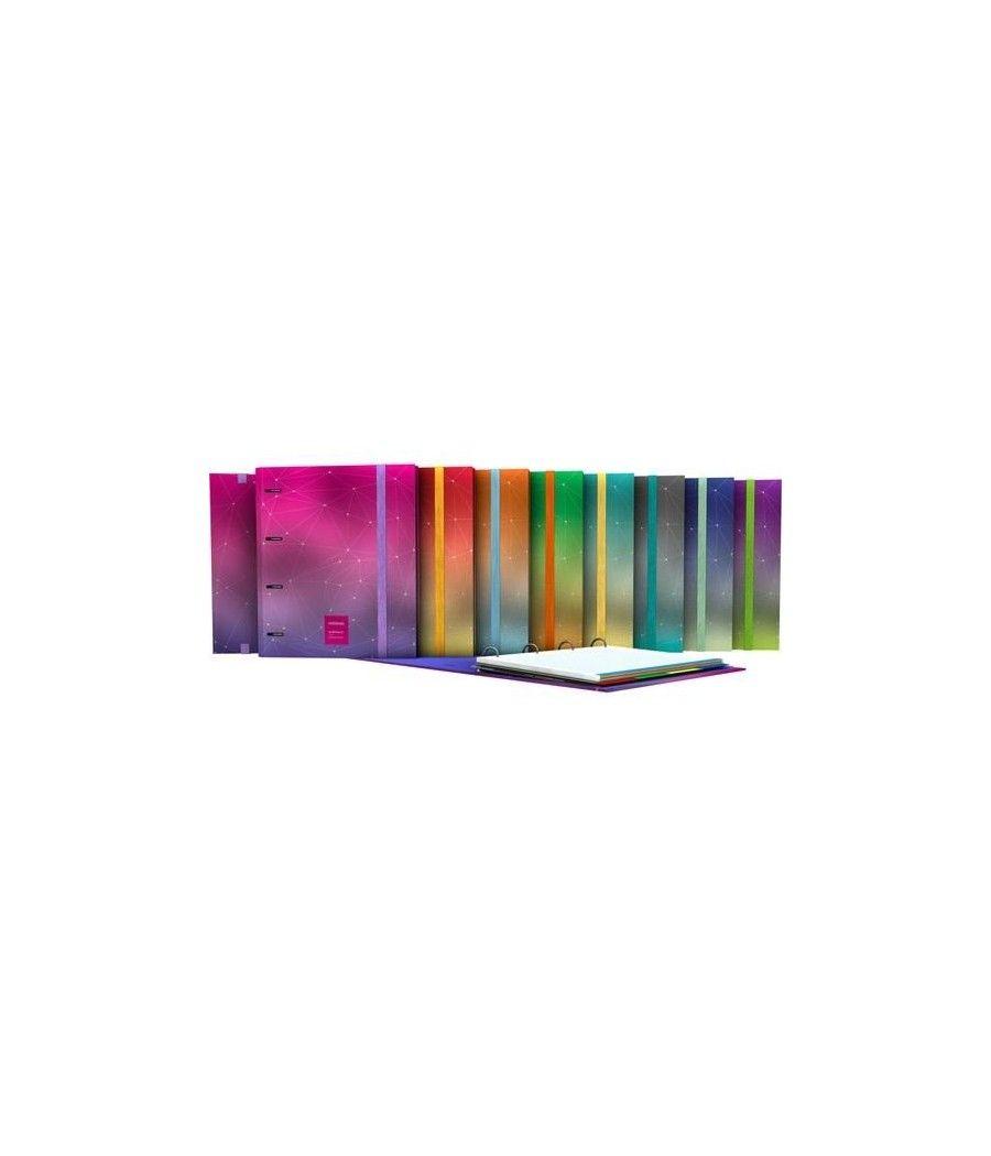 Surtido de cuadernos con las siguientes características: - Cuadernos con cubiertas en polipropileno - Mecanismo de espiral metálica - En formato Cuarto (1/4) - Con 80 hojas interiores: · Gramaje de 90g/m2, · Microperforadas, · Con 4 taladros, · 5 bandas de color, · Cuadrícula de 4mm, · En papel certificado FSC® Surtido con todos los colores de la gama «UNEQUAL METALLIC»: * Negro, verde, verde agua, azul, violeta, rojo, naranja y fúcsia